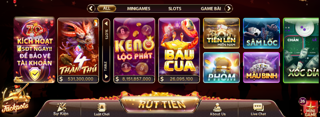 Keno: Keno lộc phát… Game nhanh: Kim cương, Xèng 777, Xì dách hoàng gia,… Slots & Nổ Hũ: Săn rồng, Volta, Một số game khác: Thần tài, thủy cung,…